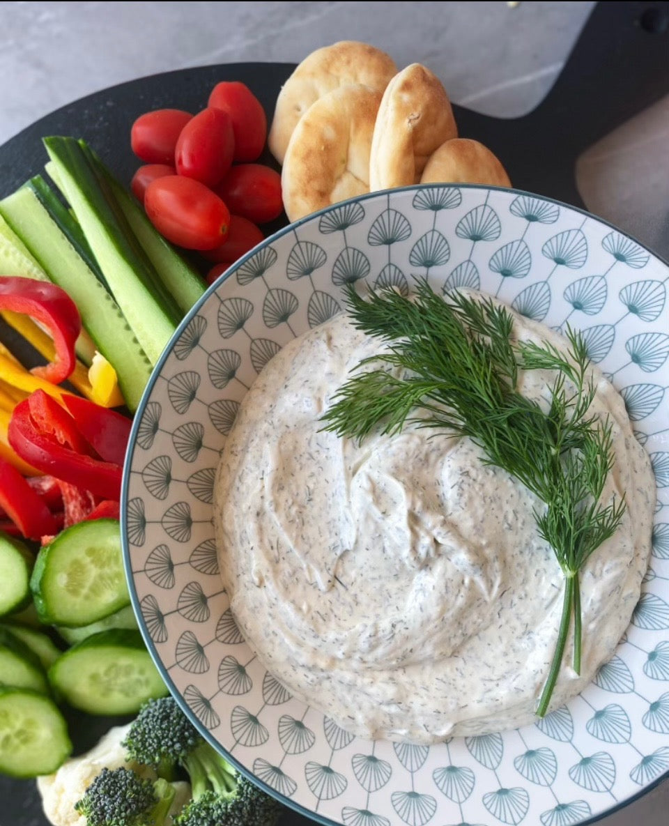The ranch seasoning adds herby notes from dill, parsley, and chives, along with a hint of garlic and onion. The dill pickles introduce a zesty, vinegary tang with a crunchy contrast, enhancing the dip's brightness. Altogether, it's a bold, refreshing dip with a balance of creaminess, tang, and herby zest.